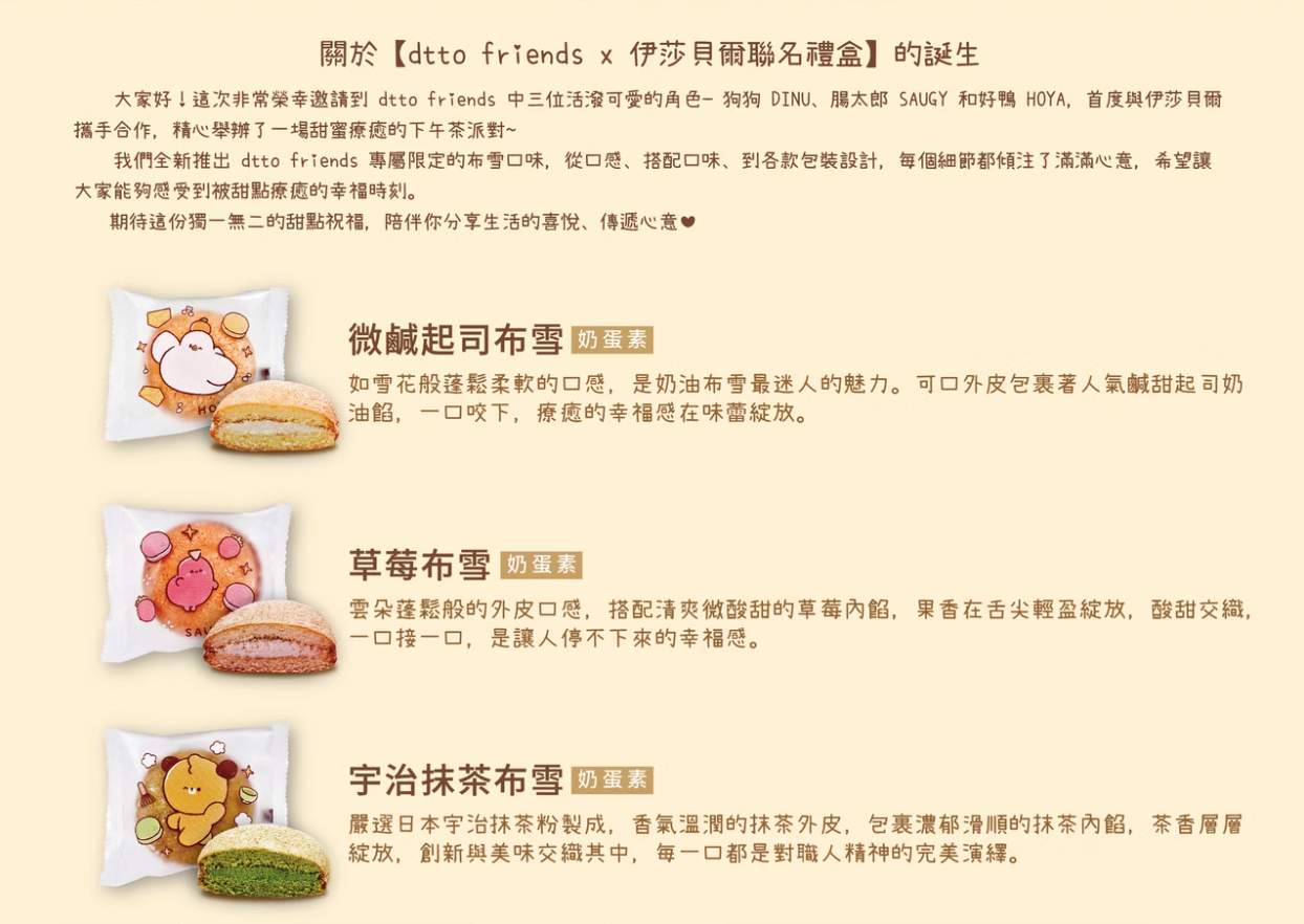 伊莎貝爾首度攜手人氣角色品牌 dtto friends,推出聯名限量版布雪系列禮盒。由活力滿滿的狗狗DINU、慵懶可愛的腸太郎SAUGY,以及呆萌療癒的好鴨HOYA領銜登場,聯手詮釋伊莎貝爾招牌布雪,並推出聯名限定布雪新口味:草莓、抹茶,傳遞給每位貴賓/收禮者滿滿的美味,無論是送禮或自己收藏都是超值首選。