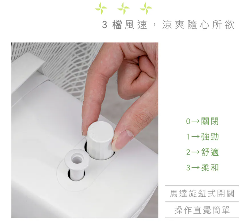 • 3檔風速調節,柔和到強勁